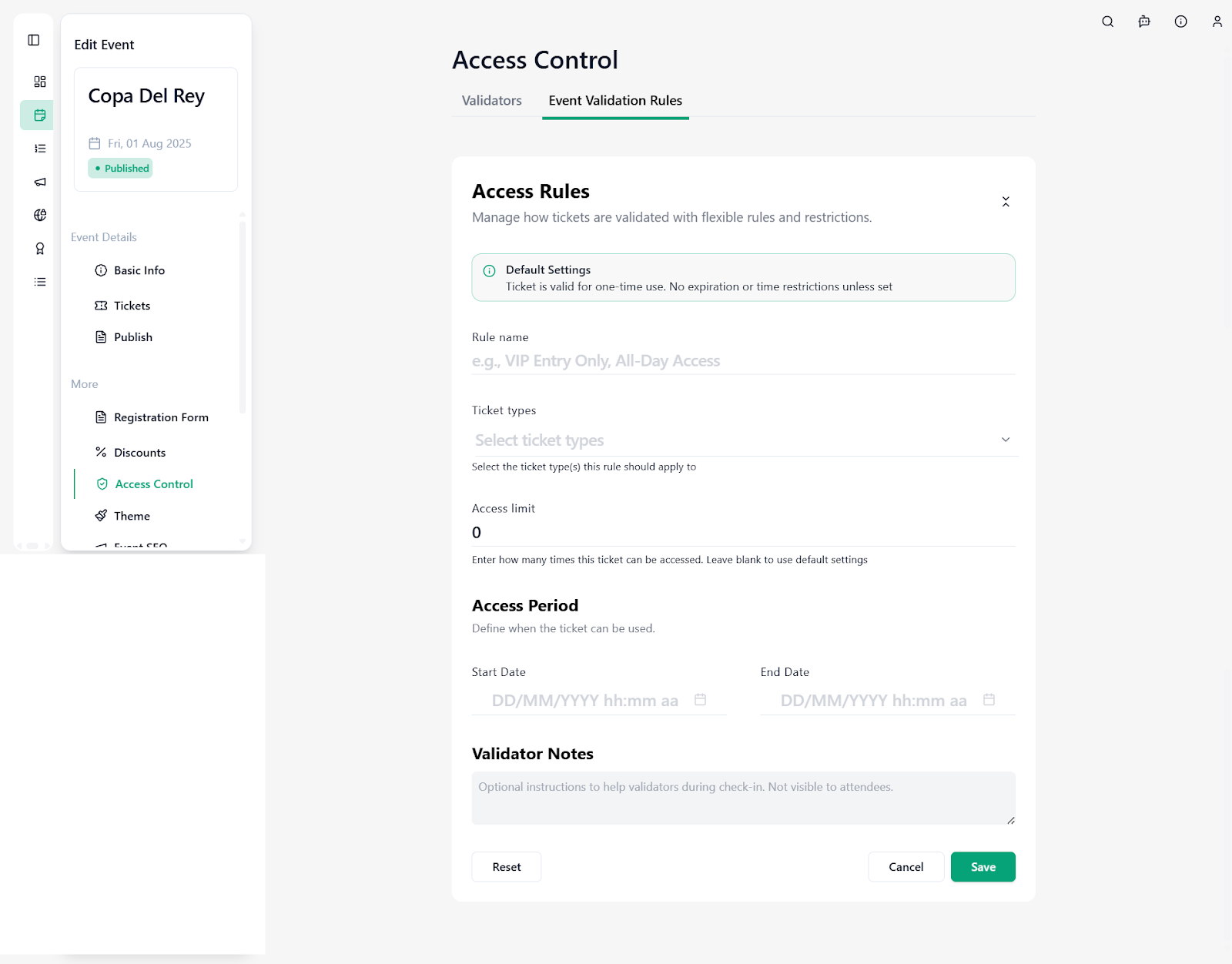 Define the Access Period by specifying the Start Date and End Date when the ticket is valid.