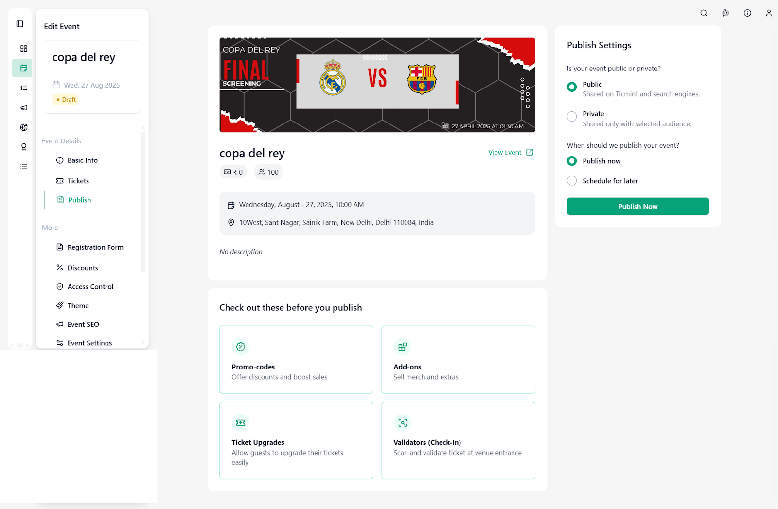 Event Creation: The last step involves a thorough review and publication of your event details.