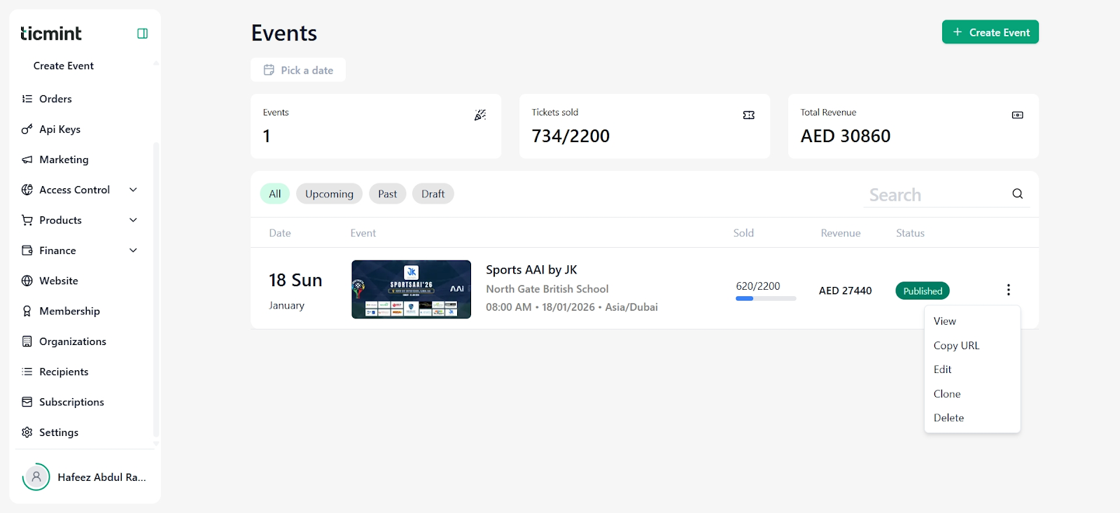 From here, you can view event summaries, ticket sales, and take quick actions, such as creating an Event.