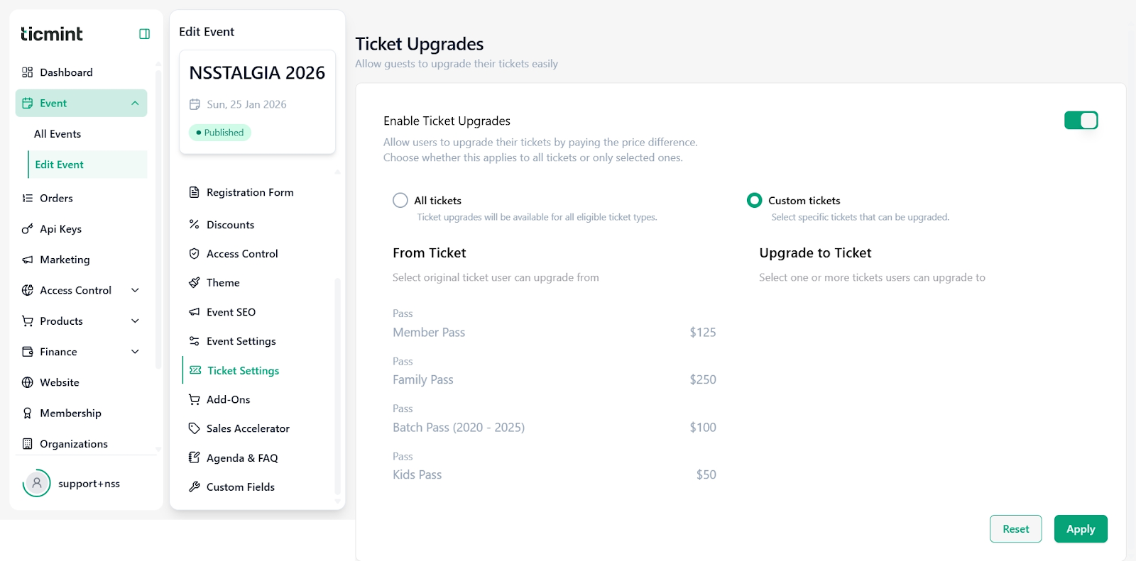 You will now see the Ticket Settings dashboard for the selected event.