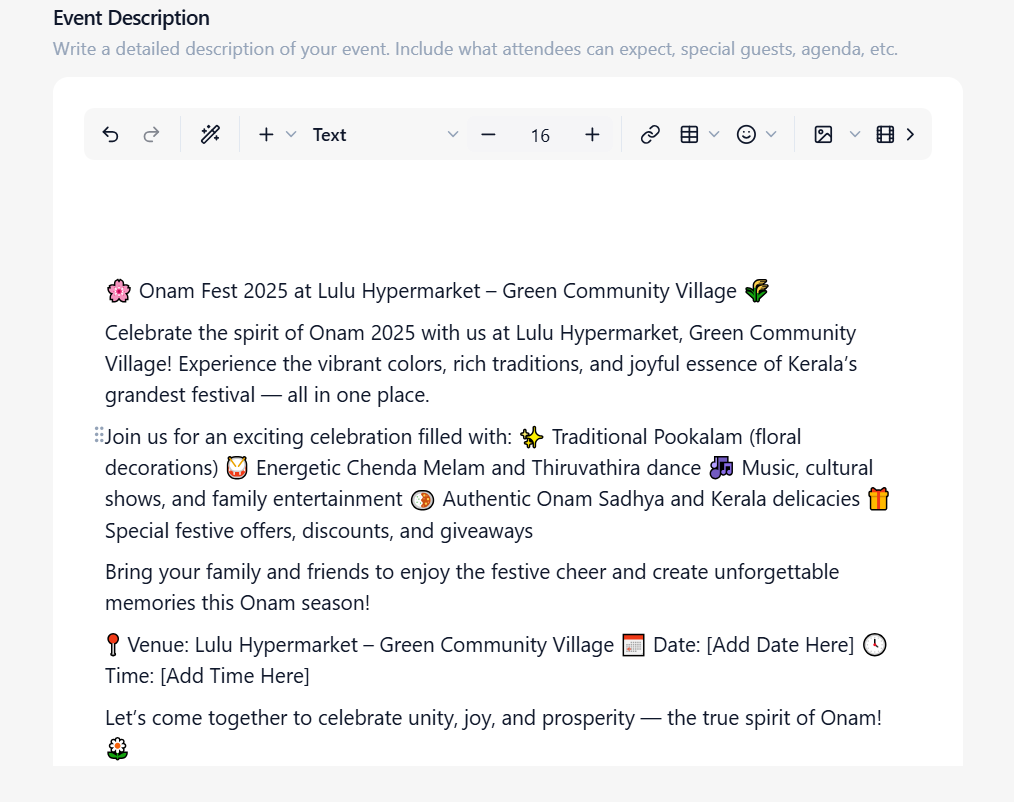 Use visuals like promo creatives, previous event highlights, or venue walkthroughs.