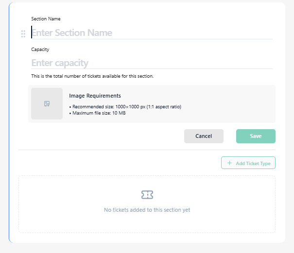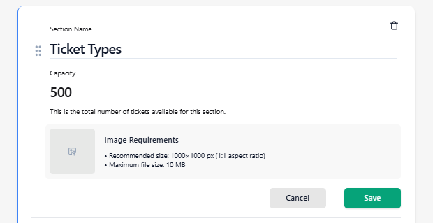 ⚠️ Note: Section capacity acts as a hard limit. The total capacity of all ticket types inside a section cannot exceed the section capacity.