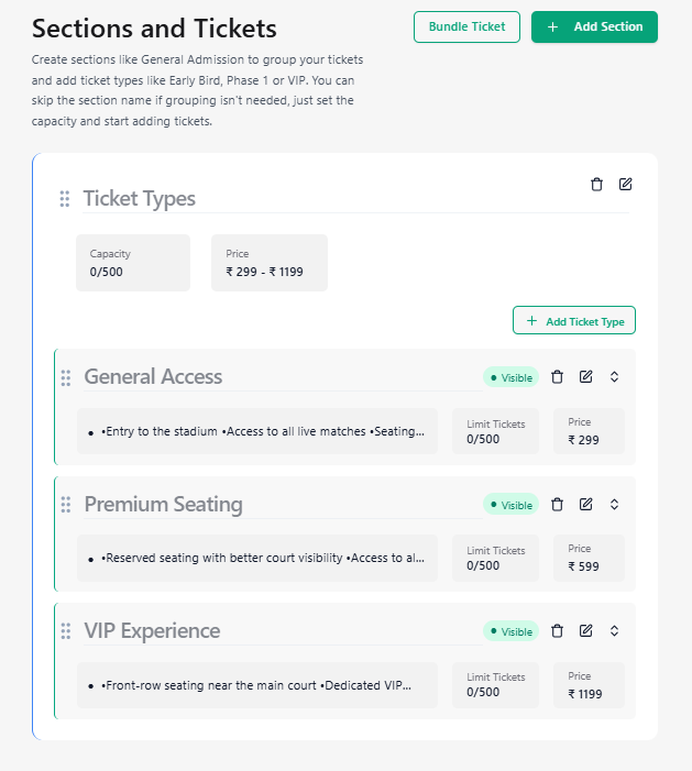 You will see all configured Sections (e.g., VVIP, VIP, General) along with their ticket types.