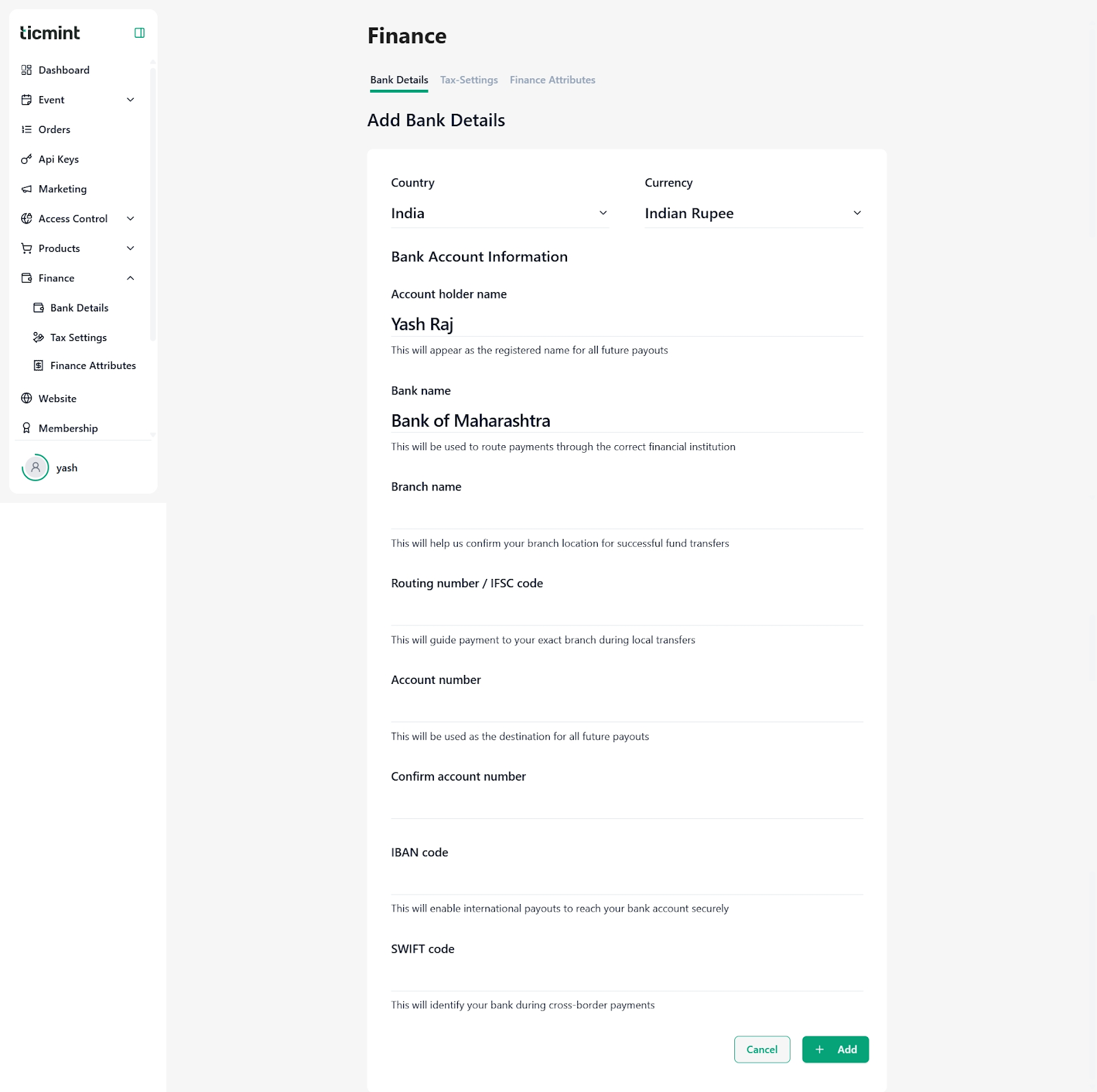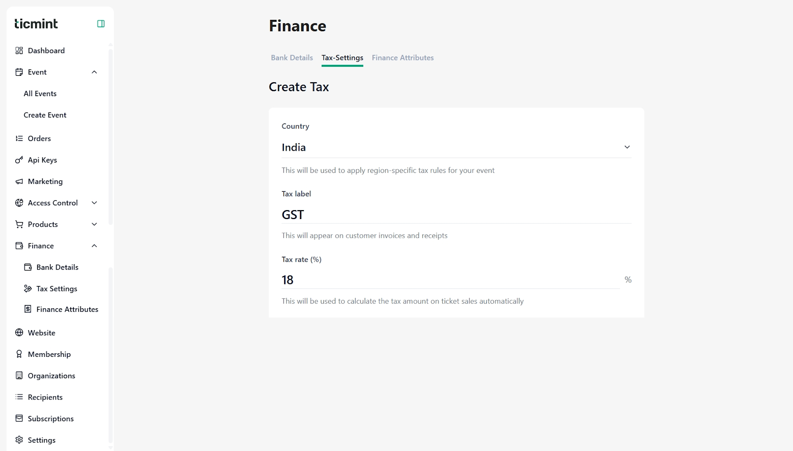 This document explains how to set up and manage Finance settings on the Ticmint Partner Dashboard. Follow the steps below to configure bank details, tax settings, and finance attributes correctly.